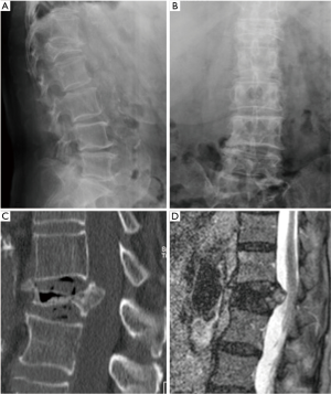 Spine Jack® is a new device for mechanical kyphoplasty (MK). It is a titanium implant designed to restore the height of the vertebral body in OVF, primary or secondary bone tumors, or traumatic fractures (A1, A2, A3.1 and type B in selected cases, according to AO classification) (6). The X-Core® adjustable VBR System is a vertebral body replacement device, indicated for use in the thoracolumbar spine (T1 to L5) to replace a diseased or damaged vertebral body caused by tumor or fracture, to restore height of a collapsed vertebral body and to achieve decompression of the spinal cord. It is an expandable titanium cage. Due to the wide footprint, the cage rests on the ring apophysis, enhancing biomechanical support. The cage was expanded in order to reduce partially the local kyphosis using the superior and inferior vertebral endplates as points of fixation. It is intended to be used with supplemental internal spinal fixation systems (7). Since February 2016, 9 patients (2 men and 7 women; mean age 81 years) affected with VP due to OVF were subjected to surgical treatment. The thoracic spine was involved in 3 cases and the lumbar spine in 6 cases. In 8 patients the thoracolumbar junction was implicated. Among the 9 patients, 7 were treated by Spine Jack®. A corpectomy was performed only in two cases (thoracic level) through the X-Core® adjustable VBR System. Preoperative radiographic exams, computed tomography (CT), and magnetic resonance imaging (MRI) were performed in all cases. Clinical outcome measures included preoperative and postoperative Oswestry Disability Index (ODI), Visual Analog Scale pain score (VAS), neurologic examination, complications, estimated blood loss, and operating time. Postoperative radiographic evaluations were made at 1, 6, and 12 months. All patients were informed about the study procedures and they signed an informed consent form. Ethical approval was obtained from the ethics clearance committee of the hospital health administration. Statistical analyses were performed independently by a nonclinical investigator assistant. The data were analyzed using standard statistical software. The results were considered statistically significant if the P value was ≤0.05 for continuous variables.