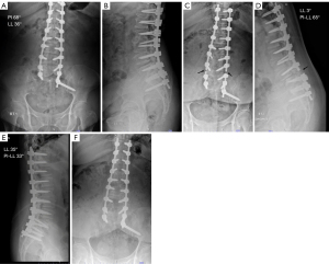 Preoperative and postoperative measurements of PI, PT, sacral slope (SS), LL, thoracic kyphosis (TK), T1 pelvic angle (TPA), SVA, and PI-LL mismatch were obtained from standing full-length lateral radiographs at various postoperative intervals (immediate, 2-week, 3-month, 6-month, 1-year, and 2-year). These measurements were performed by a fellowship-trained spine surgeon and two orthopedic residents using a Picture Archiving and Community System (PACS). Fusion of L5/S1 was assessed at the 2-year postoperative period with plain anteroposterior (AP) and lateral radiographs. For cases involving L5/S1 transforaminal lumbar interbody fusion (TLIF), the fusion status was classified as grade 2 according to the method described by Patil et al. (18). For cases with posterolateral fusion (PLF), the segment was marked as fused if there was evidence of fusion mass and stability in position.