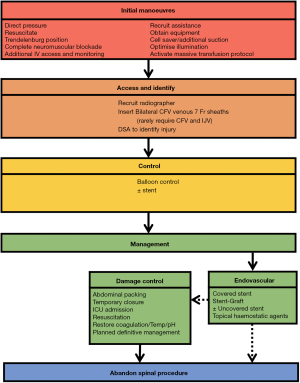 The stages of management in the event of MVI have been previously discussed in our companion open article on open management. The progress through the stages is the same when endovascular management of MVI is used (see Figure 1). These broad stages are: initial manoeuvres, establish access and identify, control, and management.