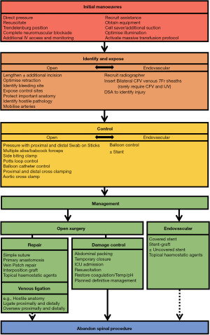 If an MVI occurs, ideally all modalities should be available for its management. The surgeons, operative staff and hospital need to be appropriately equipped and capable of employing endovascular techniques. Contingency plans for the event of an MVI should have been formulated to ensure that requisite staff and equipment are available. A vascular surgeon (or interventional radiologist) is usually required to deploy endovascular devices and would be urgently consulted in the event of an MVI, if not already present.