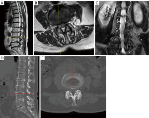 A 70-year-old female with lower back pain and radicular pain in the anterior aspect of her right leg. There was no history of major trauma, lumbar surgery, or antiplatelet/anticoagulant therapy. Muscle strength was not decreased in either leg and tendon reflex findings were unremarkable. Magnetic resonance imaging (MRI) revealed right L4 nerve root compression due to a right LFH and lumbar canal stenosis at L3–4 (Figure 1A-1C). Computed tomography (CT) revealed no calcified lesions within the spinal canal at L3–4 (Figure 1D,1E). Conservative treatment with nonsteroidal anti-inflammatory drugs was initially administered; however, there was insufficient improvement, and a local anesthetic injection into the right L4 nerve root produced a transient improvement in the symptoms. Nevertheless, lower back and radicular pain gradually increased compared to the initial presentation, and the patient underwent FEL under general anesthesia under fluoroscopy.