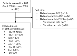 There were 122 patients with degenerative spinal conditions who were referred by 10 surgeons for consideration of ACT from September 2020 to June 2023 (Figure 1). Of these, 46 were excluded from our analyses because they did not complete all ACT sessions (n=14), or because they did not complete baseline (n=1) or follow-up (n=31) PROMs. We note that the baseline scores of those who did not complete follow-up PROMs were similar to those who did (Table S1). An additional 13 patients were further excluded because after they were reviewed by the ACT physicians because they were judged to not require the program because they were found to have minimal psychological comorbidity with scores that were significantly lower than those who were included (Table S2).