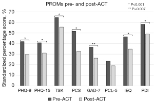 Data are presented as mean ± standard deviation. ACT, acceptance and commitment therapy; GAD-7, Generalized Anxiety Disorder 7 item; IEQ, Injustice Experience Questionnaire; PCS, Pain Catastrophizing Scale; PCL-5, PTSD Checklist for DSM-5; PHQ-9, Patient Health Questionnaire 9 item; PHQ-15, Patient Health Questionnaire 15 item; PDI, Pain Disability Index; PROMs, patient-reported outcome measures; PTSD, post-traumatic stress disorder; TSK, Tampa Scale for Kinesiophobia.