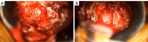 Once a good exposure was achieved and the correct level confirmed with fluoroscopy (with an instrument such as a Watson Cheyne dissector in the target foramen), an operating microscope was used.