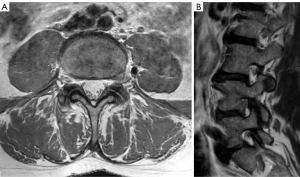 Patients were anaesthetised (general anaesthetic) and placed prone on a Wilson frame or Jackson table or equivalent. A preoperative fluoroscopic level check was performed, and the midline was marked. An example of a left L4/5 FLDH is shown in Figure 1 via axial (Figure 1A) and sagittal (Figure 1B) T2-weighted magnetic resonance imaging (MRI) images. Depending on the level, a paramedian incision of approximately 4 cm length was marked in the range of 2.5–4.5 cm from the midline. For example, 2.5 cm at L2/3, 3 cm at L3/4, 3.5 cm at L4/5 and 4 cm at L5/S1. Adjustments were made depending on patient weight, musculature, fat distribution and with reference to the preoperative MRI measurements from the midline to the outer edge of the superior articular process (SAP) of the caudal vertebra. Often, we added 0.5 cm to these measurements due to thickness of fat above lumbar fascia.