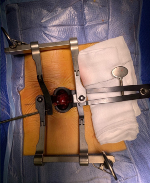 An initial Aesculap microdiscectomy retractor was placed, flat blade facing laterally, curved ones superior and inferior. Flat lateral blade was usually about 1–2 cm longer than cranio-caudal blades to help retract muscle over inter-transverse membrane.