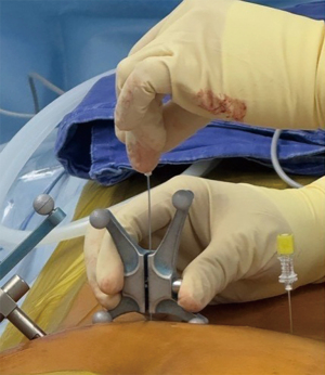 The intraoperative ESP block guided by O-arm navigation during TLIF represents a novel technique. Previous publications have primarily focused on the use of ultrasound and fluoroscopic guidance for ESP blocks (1-3). In this procedure, the author selected a spinal needle instead of a peripheral nerve needle due to the absence of a line connector on the spinal needle, as the presence of such a connector on the needle could become dislodged and disturb the navigated procedure (4). Since the spinal needle may shift during the procedure, the author recommends verifying the final placement with an X-ray before administering the injection. Additionally, it is crucial to ensure that the needle remains in contact with the bone throughout the procedure, specifically positioned on the transverse process.