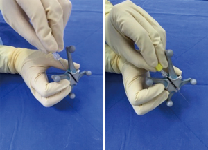 The navigation system is calibrated and aligned to facilitate the needle trajectory. A dilator tracker, devoid of a navigated dilator (Figure 1), is employed to ensure proper navigation toward the needle placement path (Figure 2). In the scout image’s coronal view, the trajectory is adjusted from linear to circular, aligning with the target transverse process while keeping the dilator tracker steady (Figures 3,4).