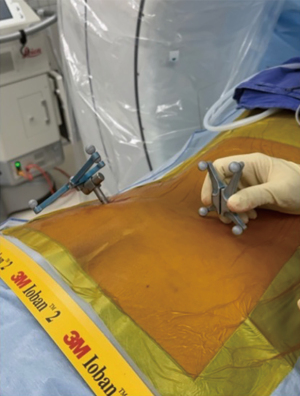 This section details the procedural steps for performing an intraoperative ESP block guided by O-arm navigation during TLIF surgery. This technique is easily applicable in surgeries that already utilize O-arm navigation, particularly in cases involving the insertion of pedicle screws. Proper preoperative preparation is essential to ensure the effectiveness and safety of the intraoperative ESP block guided by O-arm navigation during transforaminal lumbar interbody fusion (TLIF) procedures. Before surgery, the patient must undergo a thorough preoperative evaluation to assess their medical history, surgical indications, and any potential contraindications to regional anesthesia techniques. The operating room should be equipped with an O-arm imaging system and a compatible navigation system to allow for precise visualization and guidance. All surgical and anesthetic equipment, including a 22-gauge spinal needle, local anesthetics such as 0.5% marcaine or 2% xylocaine, and adjuvants like 10 mg of dexamethasone, must be readily available. Sterile supplies and drapes should be prepared to maintain aseptic technique during the procedure. The navigation system must be calibrated in advance to ensure accurate synchronization with the O-arm images. Adequate communication between the anesthesiology and surgical teams is crucial to plan the timing and administration of the ESP block within the surgical workflow.