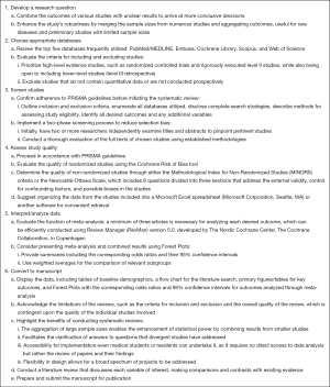 After determining a research question, it’s crucial to identify the variables and both primary and secondary outcomes for the investigation, taking into account the variables commonly reported by individual studies. A meta-analysis necessitates a minimum of three studies for each variable. When aiming for journal publication, the quality and quantity of the included studies are significant. Authors should generally include at least seven papers, with a minimum of level III evidence (retrospective case cohort) being desirable. Therefore, the selection of databases and the establishment of inclusion and exclusion criteria are particularly critical.