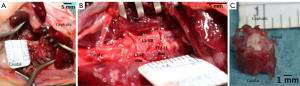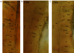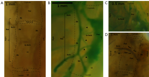 Next, 20 Wistar rats received an injection of 180–200 mL/kg of a latex solution into the left ventricle—10 rats with a red-colored and 10 with a blue-colored latex solution—until adequate peripheral contrast perfusion was observed. Following this, the animals were euthanized by anesthesia overdose, and the T12–L1–L2 spine segment was dissected by an anterior abdominal retroperitoneal approach. Incisions were made at the T11–T12 and L2–L3 intervertebral discs, and the entire vertebral segment, including its vascular pedicle, was removed en bloc. This technique enhances the visualization of vascular structures as they typically appear during surgical procedures (36). Those 20 vertebral blocks underwent diaphanization treatment and were converted into modified Spalteholz-cleared specimens. This method preserves vascular and perivascular structures while rendering the specimens transparent, allowing for detailed three-dimensional visualization (37,38). Both the vascular corrosion-fluorescence and diaphanization specimens were analyzed through direct observation and optical microscopy in order to identify vertebral body arteries previously described in the available literature on the Wistar rat, as well as by analogy with the vascular anatomy of the human lumbar vertebral body.