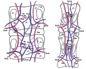 Regarding the present study, the three L1 vertebrae subjected to the vascular corrosion-fluorescence technique, along with the 20 diaphanized vertebrae, allowed the identification of several arteries shared with the arterial vascularization of the human lumbar vertebral body, confirming their similarity in extraosseous vascular morphology. The arteries identified in both species include the lumbar segmental arteries, Hma, vertical anastomoses at the level of the intervertebral disc connecting the Hma of adjacent vertebrae, Ppa, medial spinal branch of lumbar artery, Ascb, ascending and descending branches of the Ascb contributing to the Raa, posterior intervertebral anastomosis with the contralateral Ascb, the origin of the posterior nutritive arteries, the Rb of the lumbar artery, and the descending branch of the radicular artery accompanying the spinal nerve. These similarities in the extraosseous arterial vascularization of the vertebral body are evident and have already been partially confirmed by the study of Konerding and Blank (34,42-51). We illustrated this comparison in Figures 6-9, by recreating the vasculature of the human vertebral body side by side with our suggestion of the vasculature of Wistar rats’ vertebral body, based on the findings of our study and previously described literature for humans and rats (33,34,42-51).