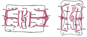 Several studies over time have contributed to defining what is currently accepted as the vascular anatomy of the lumbar vertebral body in the adult human. The description of the extraosseous arterial vascularization of the lumbar vertebral body through the lumbar arteries has been well established and widely accepted since its original description by Antoine Portal in 1803 (42). More than a century later, authors such as Hanson [1926], Wagoner & Pendergrass [1932], W. R. Ferguson [1950], Wiley & Trueta [1959], and Mineiro [1965] described anterolateral penetrating arteries entering the vertebral body at its anterolateral surfaces (Figures 6-9—Ppa, Spa, Aea, Ma) (45,47,64-66). Several other researchers have also documented these arterial branches, however controversy persists regarding the intraosseous arterial vascularization of the vertebral bodies, particularly concerning whether anterior or posterior vascular dominance prevails (33,34,42-51). Although some uncertainties remain, it is now more recognized that the main arterial supply to the vertebral body originates predominantly from the anterior region, particularly from the aorta and its collateral lumbar segmental arteries (Lsa), which extend bilaterally and course posteriorly along the midportion of the anterolateral surfaces of the lumbar vertebral body (Figures 6-9) (29,33,34,42,43). Along this trajectory, the lumbar arteries give rise to approximately 10 to 20 ascending and descending branches, known as the Ppa. From these, secondary periosteal arteries (Spa) emerge horizontally and penetrate the anterolateral surfaces of the vertebral body. These arteries give rise to three types of intraosseous arteries based on their location within the vertebral body: short peripheral arteries, which supply the outermost region of the vertebral body; anterolateral equatorial arteries (Aea), which vascularize the vertebral body’s central region; and metaphyseal arteries (Ma), which supply the intermediate region between the areas served by the other two artery types (33). The Ppa connect to a Hma located near the endplates, which, in turn, communicate with adjacent vertebrae through vertical branches (Va) at the intervertebral disc surface. Upon reaching the intervertebral foramina, the lumbar arteries divide into three main branches: the medial spinal branch (Sb), the lateral branch, and the dorsal muscular branch (Dmb). Regarding the vascularization of the vertebral body specifically, the medial spinal branch is of particular interest, as it gives rise to the following arteries: the Ascb, the posterior spinal canal branch (Pscb), and the Rb. The Ascb, upon entering the intervertebral foramen, bifurcates into ascending and descending branches (Ab, Db), which anastomose, inside the vertebral canal, with those from adjacent levels as well as with the contralateral homologous artery (through the intervertebral anastomose—Ia-Ascb), forming H-shaped anastomotic networks known as Raa. From the transverse union of the two Ascbs, two posterior nutrient arteries arise (Pna). These arteries penetrate the vertebral body through the basivertebral foramen and supply its posterior portion (33,34,42-51). Regarding the venous vascularization of the lumbar vertebral body, it was studied earlier than its arterial counterpart, and its description has always been more consistent, with the currently accepted anatomy closely resembling the original classical descriptions (67-70). The intraosseous venous network contributes to the formation of the two main venous drainage plexuses of the vertebral body: the anterior external vertebral venous plexus (Aevvp), located in the anterior portion of the vertebral body and the anterior internal vertebral venous plexus (Aivvp), positioned retrovertebrally within the vertebral canal, which receives the basivertebral vein (Bv) originating from the basivertebral foramen. These plexuses ultimately drain into the lumbar veins (Lv), which follow the course of the lumbar arteries. They are intersected and interconnected by the ascending lumbar vein (Alv), which eventually drains into the lower vena cava (67-70).