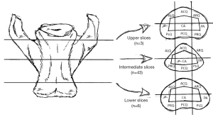 Regarding the histological analysis of the 15 vertebral bodies in which axial slices were obtained at the intermediate portion after preparation, examination, and exclusion of non-viable slices, a total of 43 slices were analyzed (Figure 2). This corresponded to the evaluation of 258 quadrants, considering the division of each axial section into six parts (ARQ, ACQ, ALQ, PRQ, PCQ, PLQ), and 86 areas when further divided into central (CA) and peripheral (PA) areas. For the five vertebrae with upper and lower slices, after preparation, analysis, and exclusion of non-viable slices, a total of three axial slices were obtained from the upper portion (corresponding to 18 quadrants and six areas), while six slices were obtained from the lower portion of the vertebral body (36 quadrants and 12 areas) (Figure 2).