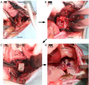 A total of 35 female Wistar rats, aged 3 months and weighing between 250 and 350 grams, were enrolled in this segment. All animals were housed under controlled environmental parameters and subjected to a 6-hour fasting period prior to surgery. All in vivo procedures adhered stringently to the ethical guidelines established in the Guide for Proper Conduct of Animal Experiments and Related Activities in Academic Research and Technology [2006]. All animal experiments were performed under project licenses granted by the institutional ethics committee of Nova Medical School, Lisbon, Portugal (No. 135/2019/CEFCM) and Faculty of Medicine, University of Coimbra, Coimbra, Portugal (No. CE-141/2023/FMUC), in compliance with Directorate General of Food and Veterinary national guidelines for the care and use of animals. A protocol including the research question, key design features, and analysis plan was prepared before the study without registration. The surgical approach is depicted in Figures 5-7, corresponding to sagittal, coronal, and axial anatomical planes, respectively. Figures 8,9 present intraoperative photographs highlighting relevant procedural details. All subjects underwent an anterior retroperitoneal laparotomy to access the first lumbar vertebral body (L1). After identification and mobilization of the aorta (Figure 9A) and the inferior vena cava, anatomical identification of L1 was accomplished based on its position directly caudal to T12, the final thoracic vertebra bearing the twelfth rib (Figures 5A,6A). Subsequent dissection exposed the anterolateral aspects of the L1 vertebral body as well as the anterior borders of the neighboring intervertebral discs (T12–L1 and L1–L2) (Figures 5B,6B,7A,8A). To more precisely define the cephalic and caudal boundaries of the L1 vertebra, a small incision was made in the anterior annulus fibrosus of the adjacent intervertebral discs. A corpectomy of L1 was then performed using fine rongeurs. The procedure began with the removal of the midline crest and was progressively extended posteriorly, preserving only a thin shell of the posterior cortical bone to minimize the risk of spinal cord injury (Figures 5B,6B,7B,8B). Previous attempts using ultrasonic vibratory instruments resulted in paraplegia, likely due to thermal injury to the spinal cord. Therefore, a purely mechanical method using rongeurs was selected. The remaining intervertebral disc tissue was excised until the adjacent endplates were fully visualized. The cartilaginous layers of the endplates were then removed using a curette, exposing the subchondral bone of the adjacent vertebral bodies. At this stage, the osseous defect site was fully defined, and the device was implanted into the void, positioned in direct contact with the posterior vertebral wall and securely lodged between the endplates of the adjacent vertebrae (Figures 5C,6C,7C,8C,9A). In certain instances, minor adjustments to the device’s length were required to accommodate individual anatomical variations. Fixation of the implant was achieved using non-absorbable sutures placed transosseously into the adjacent vertebral bodies, as well as anchoring sutures to the surrounding psoas musculature (Figure 9).