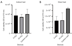 The next phase consisted of in vitro cell biology testing, performed on both irradiated and non-irradiated bioimplants, to evaluate their ability to support cellular growth. For this purpose, a commercial pre-osteoblast cell line (MC3T3-E1 Subclone 4; ATCC CRL-2593), was used, thus representing a suitable cell model for the present study. Cells were grown in Alpha Minimum Essential Medium with ribonucleosides, deoxyribonucleosides, 2 mM L-glutamine and 1 mM sodium pyruvate, but without ascorbic acid (Gibco A1049001, Grand Island, NY, USA), supplemented with heat-inactivated fetal bovine serum (FBS, VWR HYCLSV30160.03) 10% (v/v) and streptomycin and penicillin 1% (Gibco) at 37 ℃ in a humidified atmosphere with 5% of CO2. The culture medium was replaced every other day, and cells were used after reaching a confluence of approximately 80–85%. The devices used for the in vitro tests are small-scale specimens of the ones used for surgery. To determine whether exposure to irradiated PLA devices had any cytotoxic effect on MC3T3-E1 cells, an indirect toxicity assay was employed. Cells were grown in 96-well tissue culture plates and exposed to conditioned culture medium left in contact with the irradiated small scale PLA devices for 5 days in the cell culture incubator under the above conditions. Cells growing in non-conditioned and conditioned medium with non-irradiated devices were used as controls. After 2 days in culture in normal medium, the growth medium was replaced every other day with either conditioned medium from irradiated or non-irradiated devices, or non-conditioned medium. After a total of 7 days, a resazurin-based bioassay (Alamar Blue®, Thermo Scientific, Waltham, MA, USA) was performed to evaluate the viability of the cells. The cells were incubated with 100 µL of fresh culture medium supplemented with 0.1 µL Alamar Blue® (1:1,000, Thermo Scientific) for 4 h at 37 ℃ in a 5% CO2 atmosphere (92). After that period, the collected medium was transferred to a 96-well plate, and the optical density (OD) was read in a microplate reader (PerkinElmer Victor 3V, Waltham, MA, USA) at 570 nm with a reference wavelength of 600 nm. Measurements were made in triplicate. To evaluate the direct effect of the irradiated PLA devices on MC3T3-E1 cell viability, adhesion and growth, we used a direct cell viability protocol. Cells were grown in the presence of small scale irradiated and non-irradiated PLA devices in 96 well tissue plates at 37 ℃ and a 5% CO2 atmosphere for 7 days. At the end of the culture period, a cell viability assay was performed in the same experimental conditions as the one described previously regarding indirect method. The results obtained from cells growing on irradiated devices were compared with the ones from cells cultured with non-irradiated devices as well as cells growing directly on the surface of the well. Regarding cytochemistry, after the direct viability assay, MC3T3-E1 cells grown for 7 days in small scale irradiated and non-irradiated PLA devices were fixed for 1 h with paraformaldehyde (PFA) 4% in phosphate buffer saline (PBS) at room temperature. After washing with PBS, they were further permeabilized with 0.2% Triton X-100 (room temperature, 20 min). Cells were then blocked with blocking solution [1% bovine serum albumin (BSA), 1% goat serum, and 0.05% Triton X-100 in PBS] for 1 hour and stained at room temperature for 1 hour with Methyl Green (1:500 in PBS) and Alexa488 conjugated Phalloidin (1:400 in PBS) (both from Molecular Probes, Eugene, OR, USA), to visualize cell nuclei and actin cytoskeleton, respectively. The samples were mounted in anti-fading medium (n-propyl-gallate in PBS: glycerol) on a glass slide and sealed with a coverslip (93). Multi-channel composite images of the samples were acquired on a Leica SPE confocal system (Leica Microsystems, Wetzlar, Germany). Confocal microscopic images were analyzed using Image J software. Images are maximum intensity projections of approximate 100 µm confocal z-stacks.