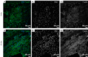 The results from the indirect cell viability assays demonstrated that the number of viable MC3T3-E1 cells was unaffected in the different conditions, therefore indicating that there was no detectable soluble mediated cytotoxic effect elicited by the PLA irradiated and non-irradiated devices on the cells (Figure 10A). The viability test of cells cultured directly on the devices showed that, although fewer cells grew on the devices compared to the bottom of the culture wells (96-well plates), the irradiation process did not adversely affect the devices’ biocompatibility (Figure 10B). The smaller number of cells growing on the devices in comparison with the plastic surface of the well is probably a measure of the available surface for cell attachment. Additionally, in Figure 11, the same cells growing in direct contact with the devices were imaged with nuclear and cytoskeletal markers and display very good adhesive properties, optimal device surface occupation, and adequate cell morphology on both non-irradiated (Figure 11, A,A1,A2) and irradiated devices (Figure 11, B,B1,B2). Indeed, MC3T3-E1 cells’ actin cytoskeleton morphology (Figure 11A, green staining) are compatible with a mesenchymal cell shape, thus accordant with the characteristics of pre-osteoblasts. The very regular nuclear morphology (Figure 11A, blue staining) does not suggest DNA fragmentation or noticeable cell death. Based on these findings, it was concluded that the 3D-printed PLA devices irradiated at 25 kGy exhibit favorable biocompatibility properties and are therefore appropriate for subsequent in vivo studies involving vertebral body replacement.