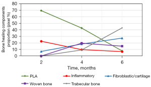 Inflammatory/granulation tissue (pixel %) | Fibrous/cartilage tissue (pixel %) | Woven bone (pixel %) | Trabecular bone (pixel %) |