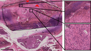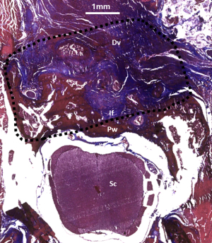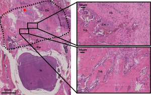 During the histological analysis, 5 vertebral samples were excluded due to extensive tissue fragmentation that rendered them unsuitable for analysis. Consequently, 25 vertebral sections with clearly identifiable device regions were retained for the final histological evaluation focused on the progression of implant osseointegration. Two PLA implants were found to have migrated anteriorly and were therefore excluded from further evaluation, as they lacked contact with the posterior vertebral wall and did not exhibit sufficient mechanical stability to support osseointegration. In both cases, which corresponded to a postoperative period of 4 months, the tissue identified within and surrounding the device consisted exclusively of inflammatory and granulation tissue. Following this exclusion, the final sample size comprised 23 specimens, which were distributed into three groups based on postoperative duration. The 2-month group included 9 specimens, the 4-month group contained 8 specimens, and the 6-month group was composed of 6 specimens. The evolution of histological parameters related to implant osseointegration at 2, 4, and 6 months is presented in Table 1 and Figure 12, which detail the percentage of pixels corresponding to PLA material and each bone repair tissue type at each time point, as well as the presence or absence of bone bridges at the interface between the device and the posterior vertebral wall. Macroscopic assessment is also included, indicating whether the device remains macroscopically visible during histological processing or has become indistinct from surrounding tissues. Representative histological images are provided to illustrate the predominant tissue types, including PLA material (Figure 13), inflammatory and granulation tissue (Figure 14), fibroblastic tissue (Figure 15), cartilaginous tissue (Figure 16), immature woven bone (Figure 17), and mature trabecular bone (Figures 18,19). A clear downward trend in the proportion of device material is observed, with a mean of 69.55%±8.16% at 2 months decreasing to 7.68%±11.24% by 6 months. Inflammatory and granulation tissue also show a decreasing profile, from 22.63%±9.45% at 2 months to 6.73%±3.24% at 6 months. Conversely, fibroblastic and cartilaginous tissue as well as trabecular bone exhibit increasing trends over time, with a more pronounced rise seen in trabecular bone. Fibroblastic and cartilaginous tissue account for 7.14%±5.70% at 2 months and increase to 27.48%±17.46% at 6 months. Trabecular bone was virtually absent at the 2-month time point, representing only 0.04%±0.13% of the analyzed area, but increased substantially to 43.12%±9.72% by the end of the 6-month period. Similarly, immature woven bone was nearly undetectable at 2 months, accounting for 0.21%±0.33%, but reached a notable proportion of 19.63%±5.81% at 4 months. At 6 months, however, the percentage of woven bone decreased slightly to 14.99%±5.77%. Statistical analysis revealed significant differences across specific time points for all evaluated parameters. The percentage of remaining device material was significantly higher at 2 months compared to both 4 months (P=0.03) and 6 months (P<0.001). The proportion of inflammatory tissue was significantly lower at 6 months in comparison with 2 months (P=0.001). Fibroblastic and cartilaginous tissue showed a significantly higher percentage at 6 months relative to 2 months (P=0.009). The amount of woven bone was significantly lower at 2 months compared to both 4 months (P<0.001) and 6 months (P=0.01). The proportion of mature trabecular bone was significantly greater at 6 months compared to 2 months (P<0.001). The interface between the PLA device and the posterior vertebral wall was also examined for the presence of bone bridges. At both 2 and 4 months, this interface showed no evidence of continuity and was instead characterized by a fibrotic tissue layer. In contrast, by the 6-month time point, 66.67% of the animals exhibited bone bridging at this interface. In some cases, the assessment of this region was hindered by sectioning artifacts. No evidence of necrosis was observed within the device region, particularly in the histological sections from the 6-month group in which the implant had been almost entirely replaced by cartilaginous or bone tissue.