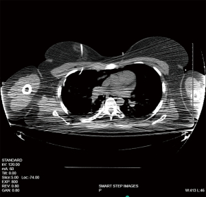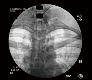 The tracheoesophageal complex was investigated, and no breach was determined. However, the patient had some air coming from the inferior aspect of the wound that was cyclical with the anesthesia ventilations. There was not a distinct link seen in this area. Valsalva was applied and there was no problem with the tracheoesophageal area. An upright fluoroscopic chest X-ray (CXR) was obtained and there was no pneumothorax identified in the operating room as determined with c-arm intensification (Figure 3).