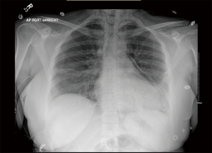 Figure 6 Anterior-posterior view portable upright X-ray captured after chest tube was taken out, demonstrating resolution of pneumothorax. AP, anterior-posterior.