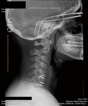 Figure 3 Anterior-posterior view of cervical spine and chest during operation; not demonstrating pneumothorax. The patient has the head of the bed elevated at 30 degrees.