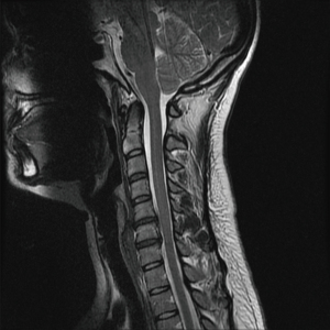 The patient was a 27-year-old right-hand-dominant receptionist for a behavioral health center who presented with neck pain and bilateral upper extremity pain in association with headaches. She had problems with fine dexterity and worsening penmanship. She also noticed herself having a poor gait, running into walls at that time. This started spontaneously in 2015 when she had awoken one morning with symptoms that progressed over time.