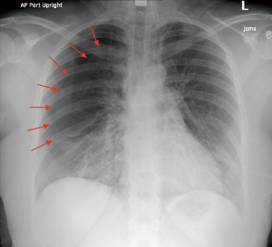 Figure 4 Post-operative upright radiograph demonstrating right pneumothorax. Arrows indicate the borders of the lung where collapsed. AP, anterior-posterior.