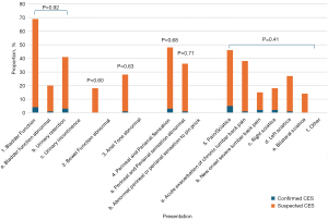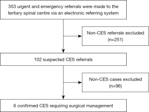 Secondary analyses looked at the presenting symptoms of suspected CES patients against true CES patients requiring spinal surgery as well as the total number of emergency and urgent referrals versus all suspected CES referrals and true CES cases which required surgical management to the tertiary spinal centre. Chi-squared test was then used to compare the confirmed and suspected CES groups.