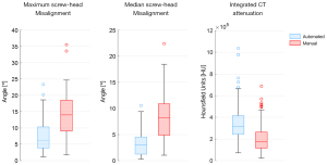 | Median screw-head misalignment (°) | 8.2 [4.9, 10.9] | 3 [1.2, 4.5] | <0.001 |