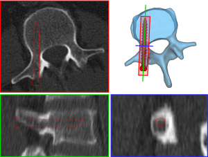 We extracted 20 CT scans from the hospital imaging database of spines without any implants, where at least five intact thoracolumbar vertebrae up to T9 were present, and where no contrast agent was used. Written informed consent was obtained from all patients for the use of their data for research purposes. The scans were anonymized before being transferred to the research environment. Median patient age was 63 [interquartile range (IQR), 54.3–73.5] years, and 72.73% were male. CT acquisition parameters varied across scans, with a median in-plane resolution of 0.4 (IQR, 0.3–0.7) mm, and a median slice thickness of 0.7 (IQR, 0.7–1) mm. Tube potential was 120 kVp for all scans, and tube current was 149 (IQR, 94–204) mA. Spinal fusion pedicle screw planning was conducted for all intact vertebrae visible in the scan.